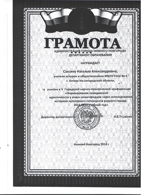 (школа является опытно-экспериментальной площадкой НИРО, научный руководитель – кандидат педагогических наук, сотрудник лаборатории гражданского образования Иткин Э.С.)