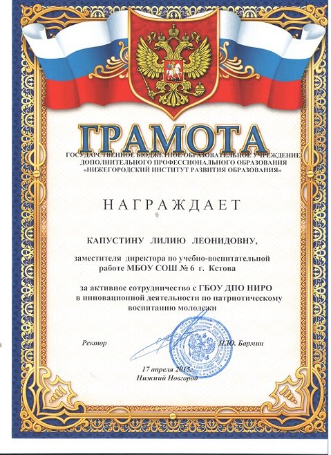 кадеты-юнармейцы получили признание и финансовую поддержку от депутата Государственной Думы Панова В.А., Военного комиссара Нижегородской области, депутата Законодательного Собрания Нижегородской области Пакова В.Н., Генерального директора ООО «Лукойл-Нижегороднефтеоргсинтез» Коваленко А.Н. и представили Нижегородскую область, Кстовский муниципальный район и школу №6 г.Кстова в составе 10 человек (6 юношей и 4 девушки) на Всероссийском слете кадетских классов «Мы – патриоты России», который проходил с 12 по 17 сентября 2017 г. в г.Анапа.
