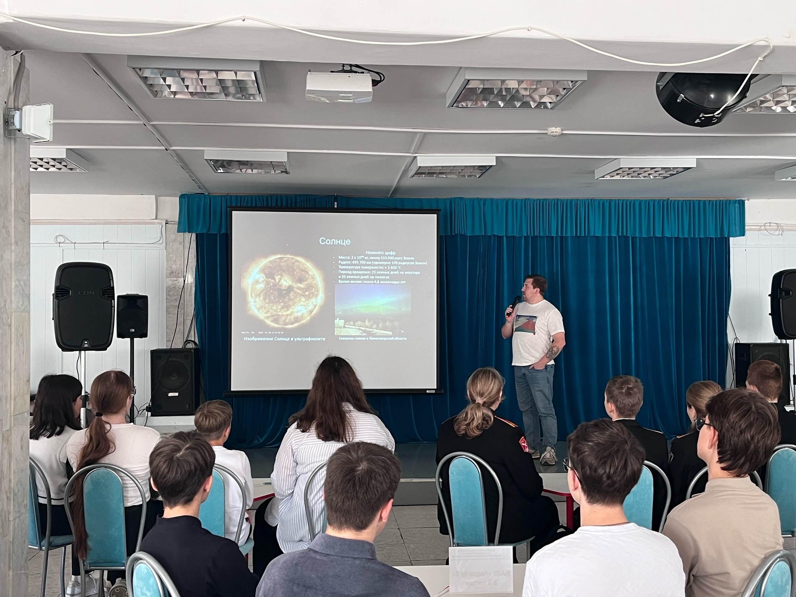 С лекцией "Как открыли горизонт черной дыры" выступил младший научный сотрудник Института прикладной физики Академии наук России Петр Михайлович Землянуха. Множество вопросов, адресованных слушателями по окончании лекции к докладчику, свидетельствовали о внимании, с каким девятиклассники воспринимали информацию. Ребят волновали и такие вопросы, не станет ли Солнце когда-то черной дырой, не приблизится ли черная дыра к Земле и т.п.